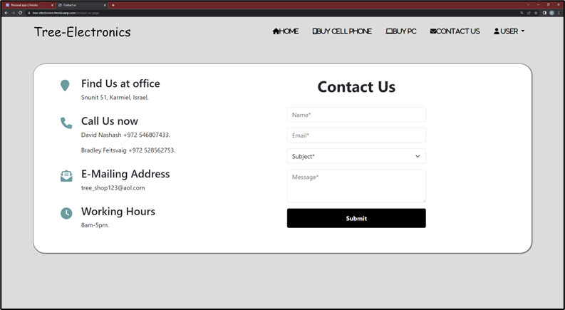 Contact us page: from dashboard click -> “contact us page”, or from sign in page -> “contact us here”. a. All fields are required, once submit is clicked a mail will be sent to tree_shop123@aol.com with the message and a copy will be sent to the user.