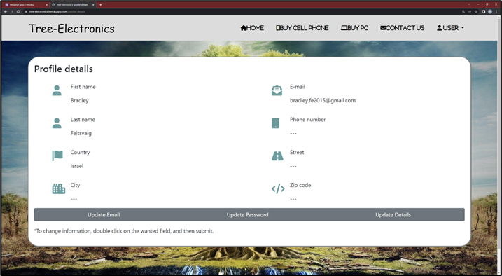 profile details page: from dashboard click -> User -> “Profile details”: a. In this page the user can update their: first name, last name, country, city, Phone number, street, zip code. b. To update double click on required field, change info and click on update. c. System will not let the user update if they left an empty field. d. To update email, click on update email and to update password click on update password.