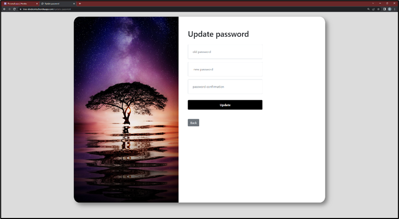 update password page: to enter click on -> “update password” in profile details page. a. 3 fields. One for old password and 2 for new (password and confirm password). b. Possible errors: old password incorrect, passwords do not match and password must be 6 characters with at least 1 number and 1 special character.