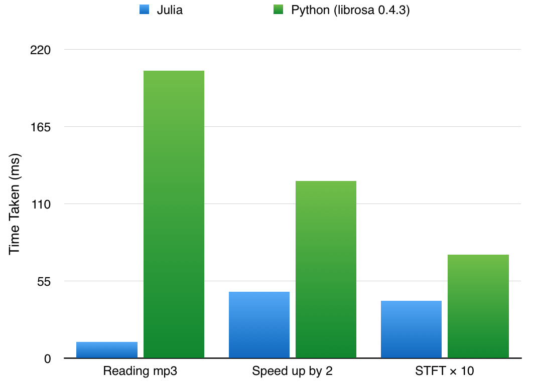 Thanks to Julia's performance optimizations, it is significantly faster than librosa, a mature library in Python