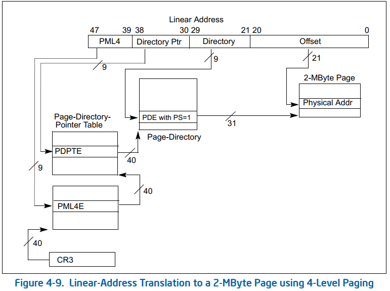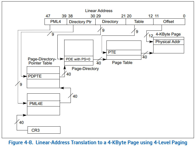 CR4.PAE = CR4.PSE = 0. The translation of a 32-bit linear address then operates as follows:- Bits 31:22 of the linear address select an entry in the guest page directory located at the guest-physical address in CR3. The guest-physical address of the guest page-directory entry (PDE) is translated through EPT to determine the guest PDE’s physical address.