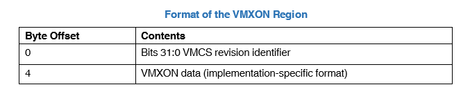 - Before executing VMXON, software should write the VMCS revision identifier to the VMXON region. (Specifically, it should write the 31-bit VMCS revision identifier to bits 30:0 of the first 4 bytes of the VMXON region; bit 31 should be cleared to 0.) =>