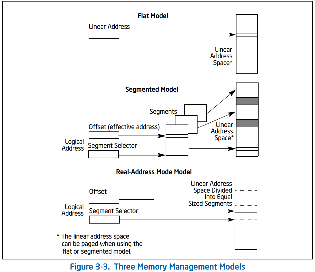 - When using the segmented memory model, each segment register is ordinarily loaded with a different segment selector so that each segment register points to a different segment within the linear address space.