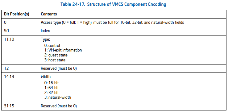 - The structure of the 32-bit encodings of the VMCS components is determined principally by the width of the fields and their function in the VMCS.