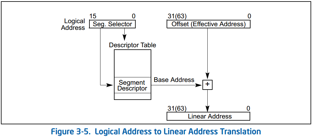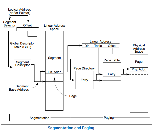 - to address a byte in a segment, a program issues a logical address (far pointer) = segment selector + offset = linear address.